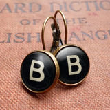 A beautiful pair of personalised alphabet leverback earrings featuring a close-up photograph of a vintage typewriter key.